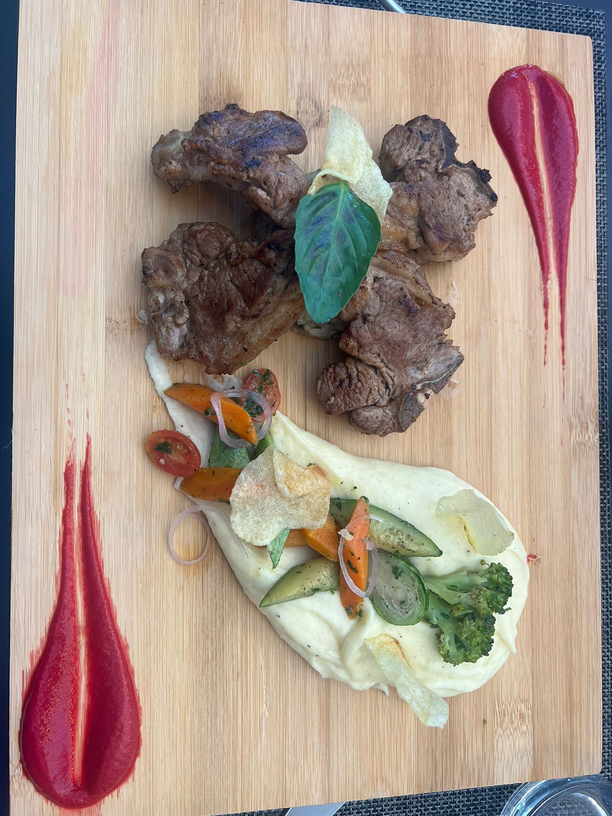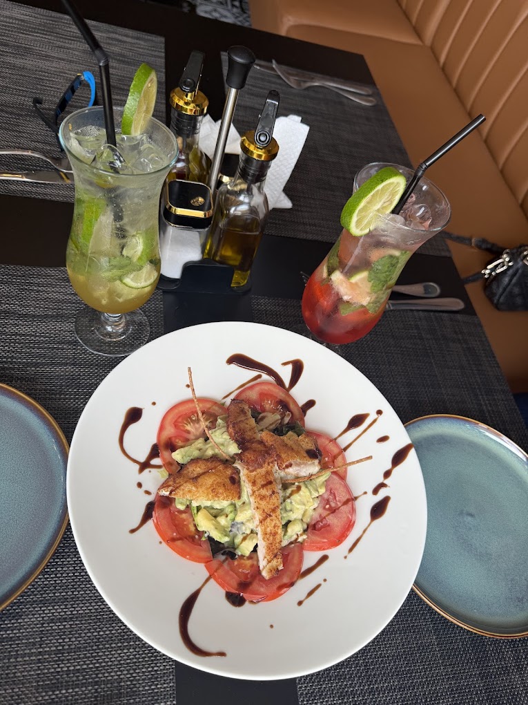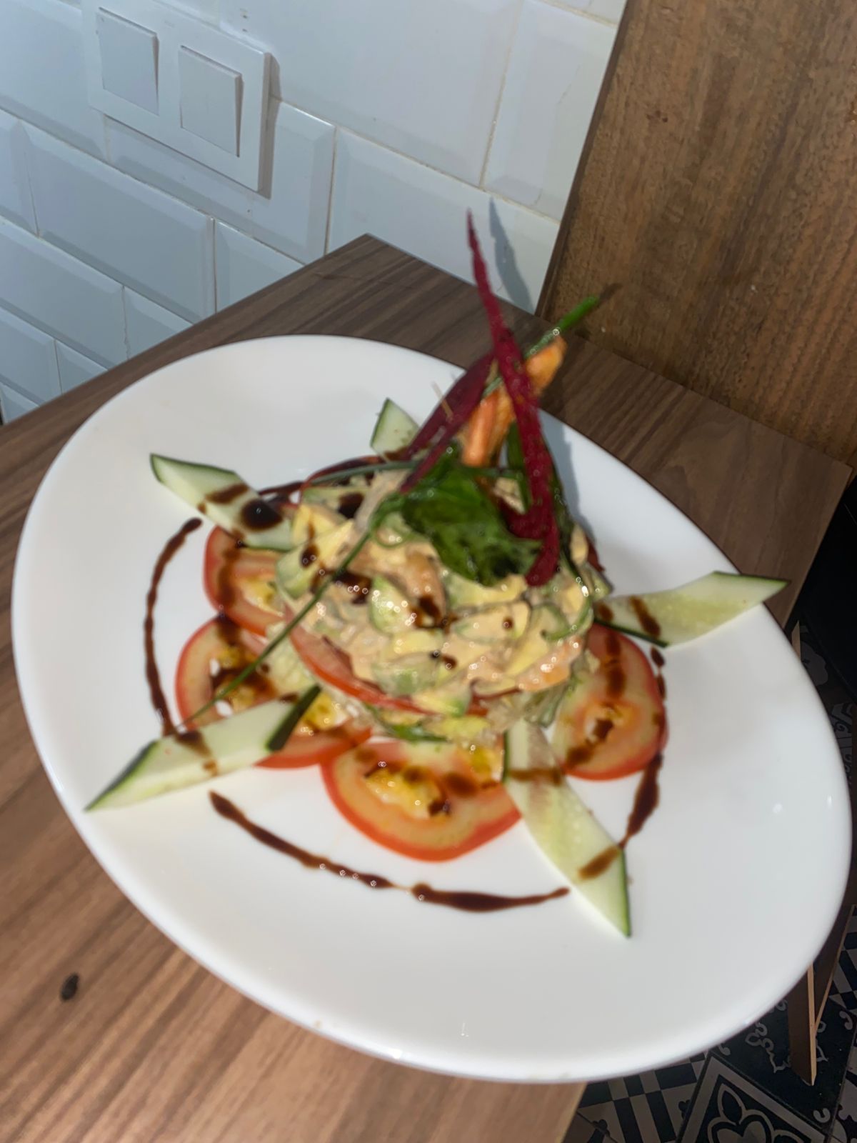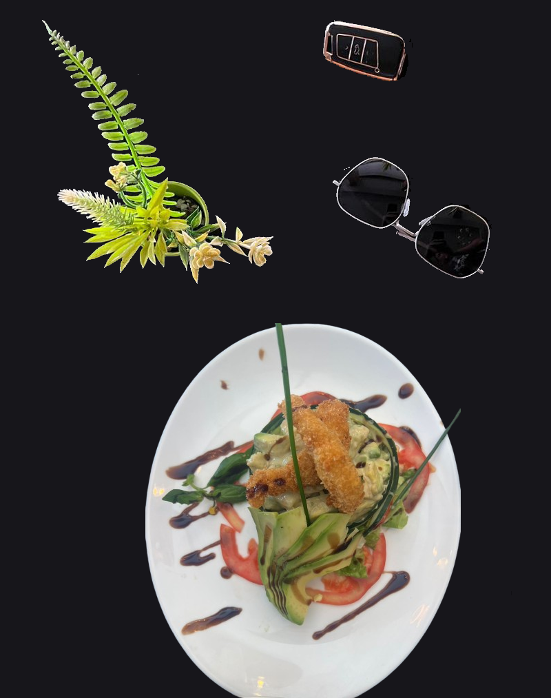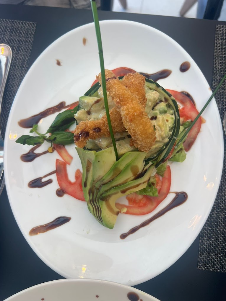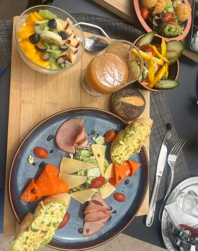 79DHTartine d'avocat, oeufs brouillés, salade mesclun de mangue, tomates cerises, concombre, assiette de fromage et charcuterie, boisson chaude, jus détox, yaourt fruits découpés.