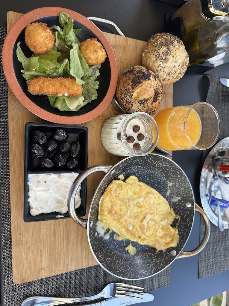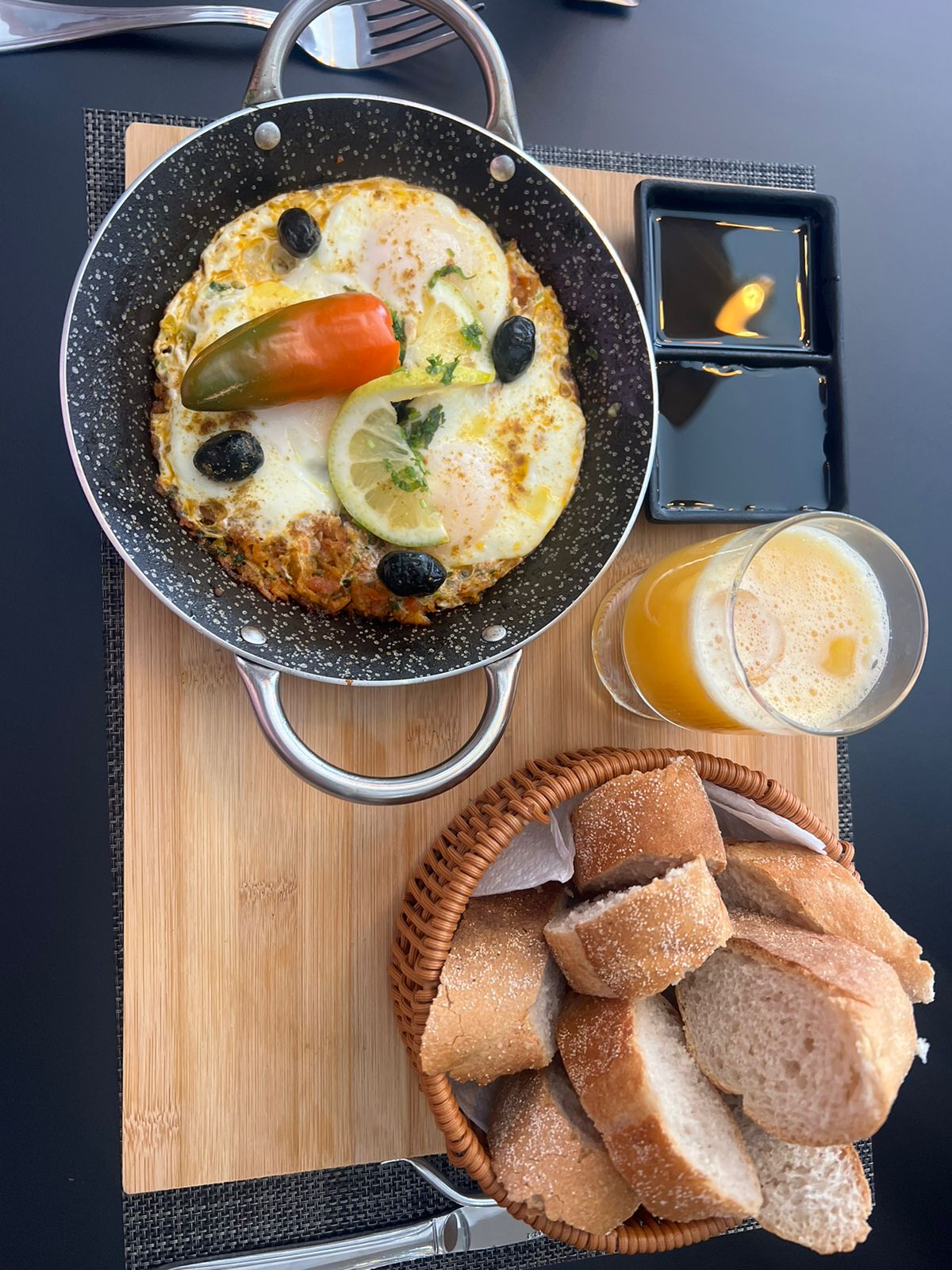 55dhOmelette au choix, nature ou fromage ou western, ou tomates, panier de pain, olives noires, ricotta, galette de pommes de terre, yaourt, boisson chaude, jus d'orange pressé ou de carotte.